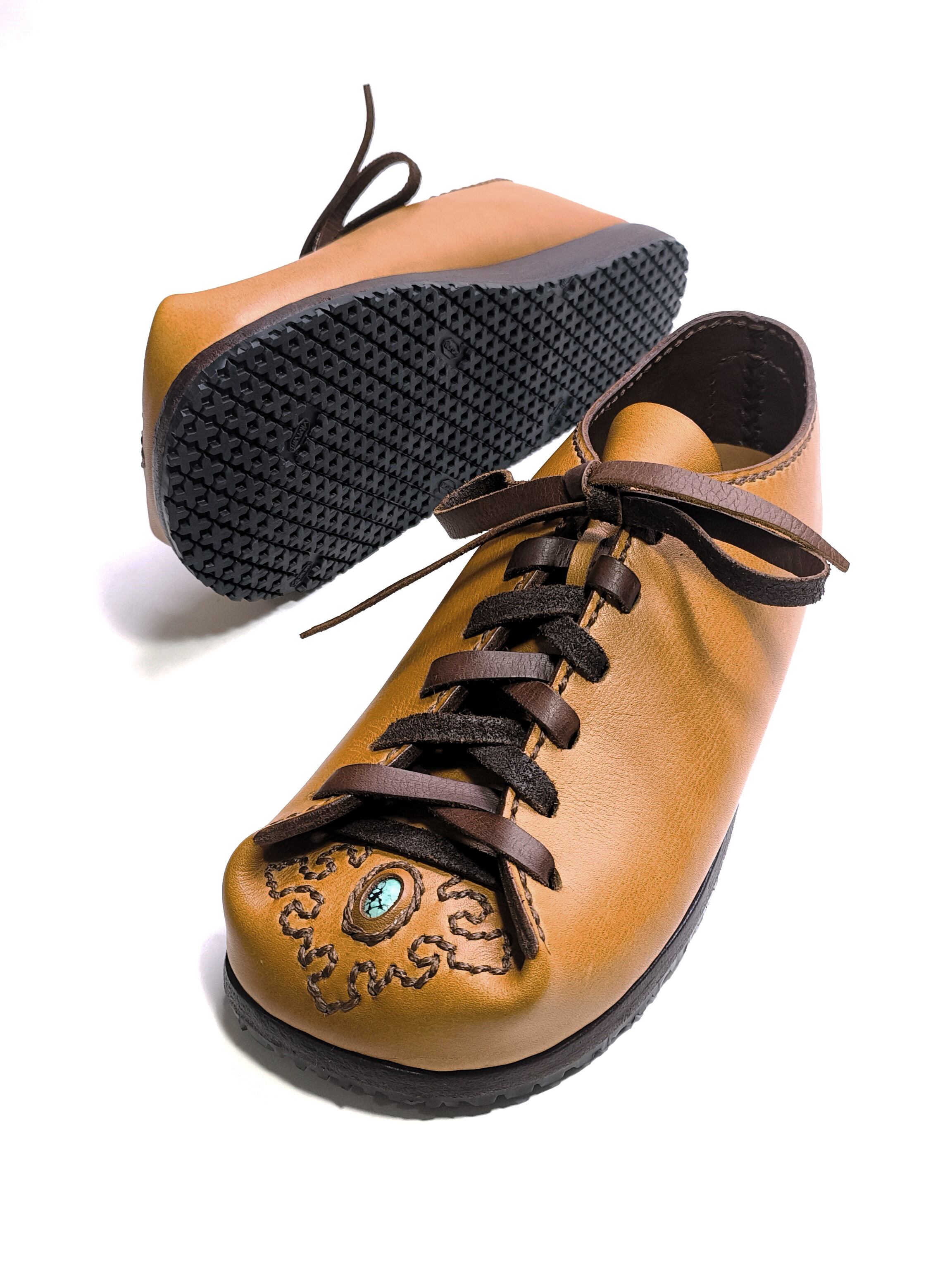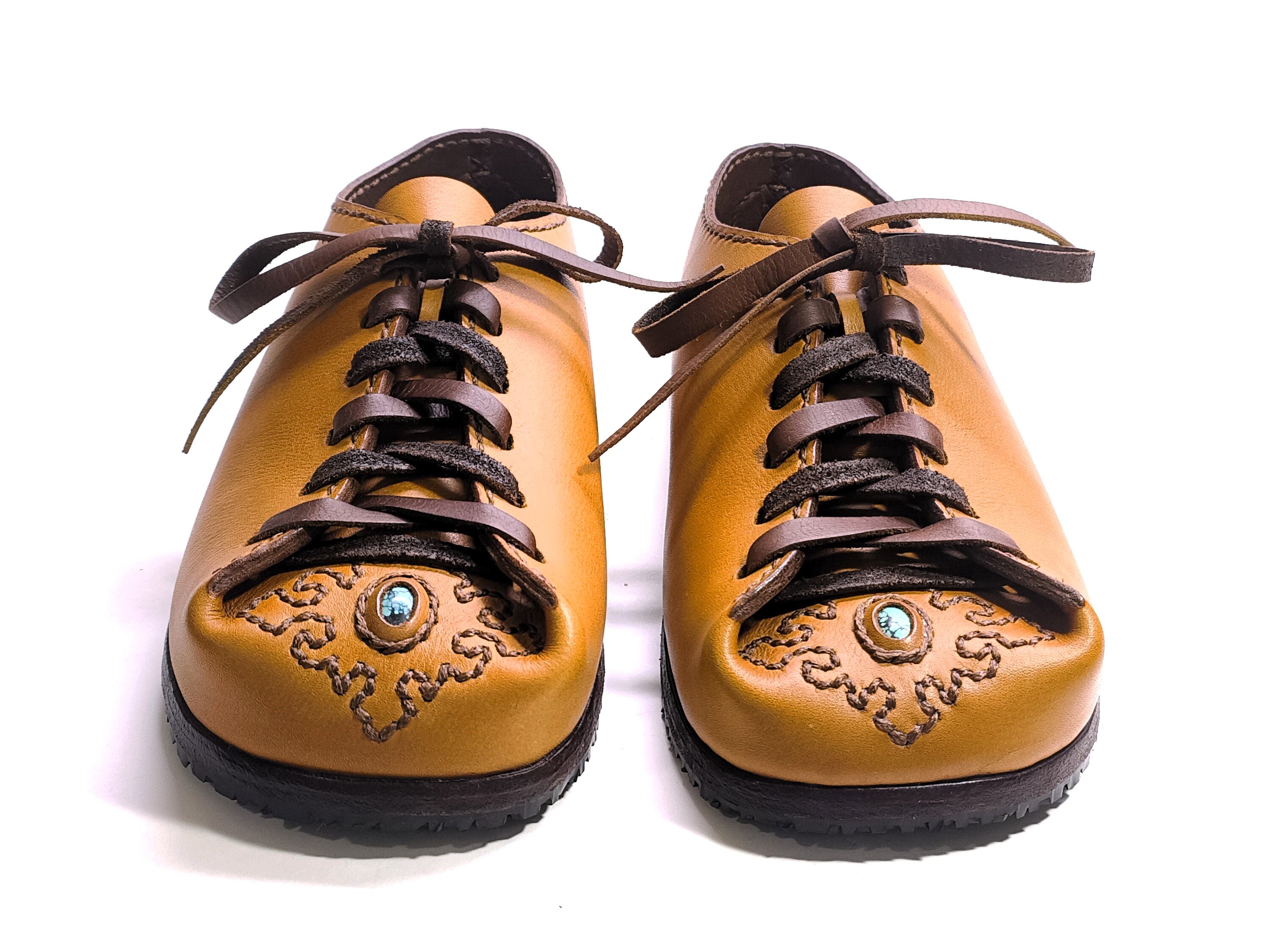 こちらの靴は、足の形に応じて少しずつ伸びる特性があります。使用されている革に厚みが有り、破棄初めに形が出来て、足の形に会うまでには痛みを感じられる事が有ります。ご注意ください。